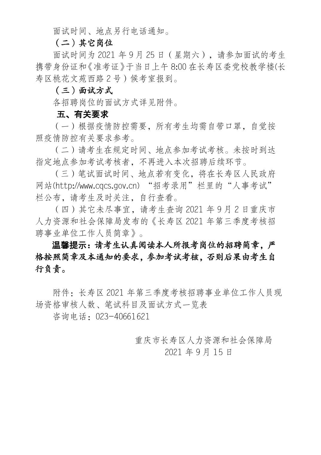 长寿区2021年第三季考核招聘事业单位工作人员现场资格审核人数、笔试、面试及相关事项的通知.pdf