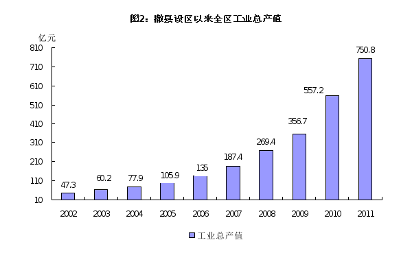 工业生产加快发展。2011年末,全区拥有工业企业1027家,其中规上企业128家,年产值过亿元工业企业为48家。2011年,全区实现工业总产值750.5亿元,增长34.7%,其中,规上工业实现总产值616.98亿元,增长40.9%。全年实现工业增加值157.09亿元,居全市第11位,同比增长26%,排全市第13位。全年工业经济效益综合指数达到264.5%。