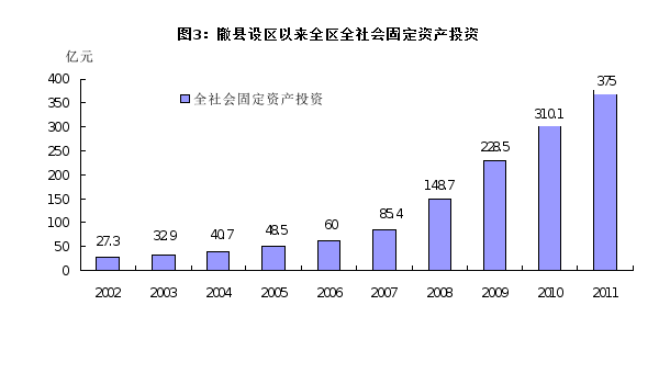 固定资产投资平稳增长。2011年,全区完成全社会固定资产投资375.04亿元,增长20.9%。完成限上项目固定资产投资310.78亿元,增长22.2%。其中:完成工业投资192.58亿元,增长9.6%。全年完成建设与改造投资308.25亿元,增长16.6%,占全社会固定资产投资的82.2%。