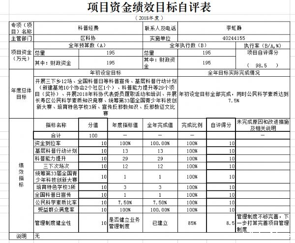 区科协项目绩效目标自评综述:科普项目全年预算数为195万元,执行数为195万元,完成预算的100%。主要产出和效果:一是全区公民科学素质达到7.5%,二是受益对象反应良好,满意度较高。