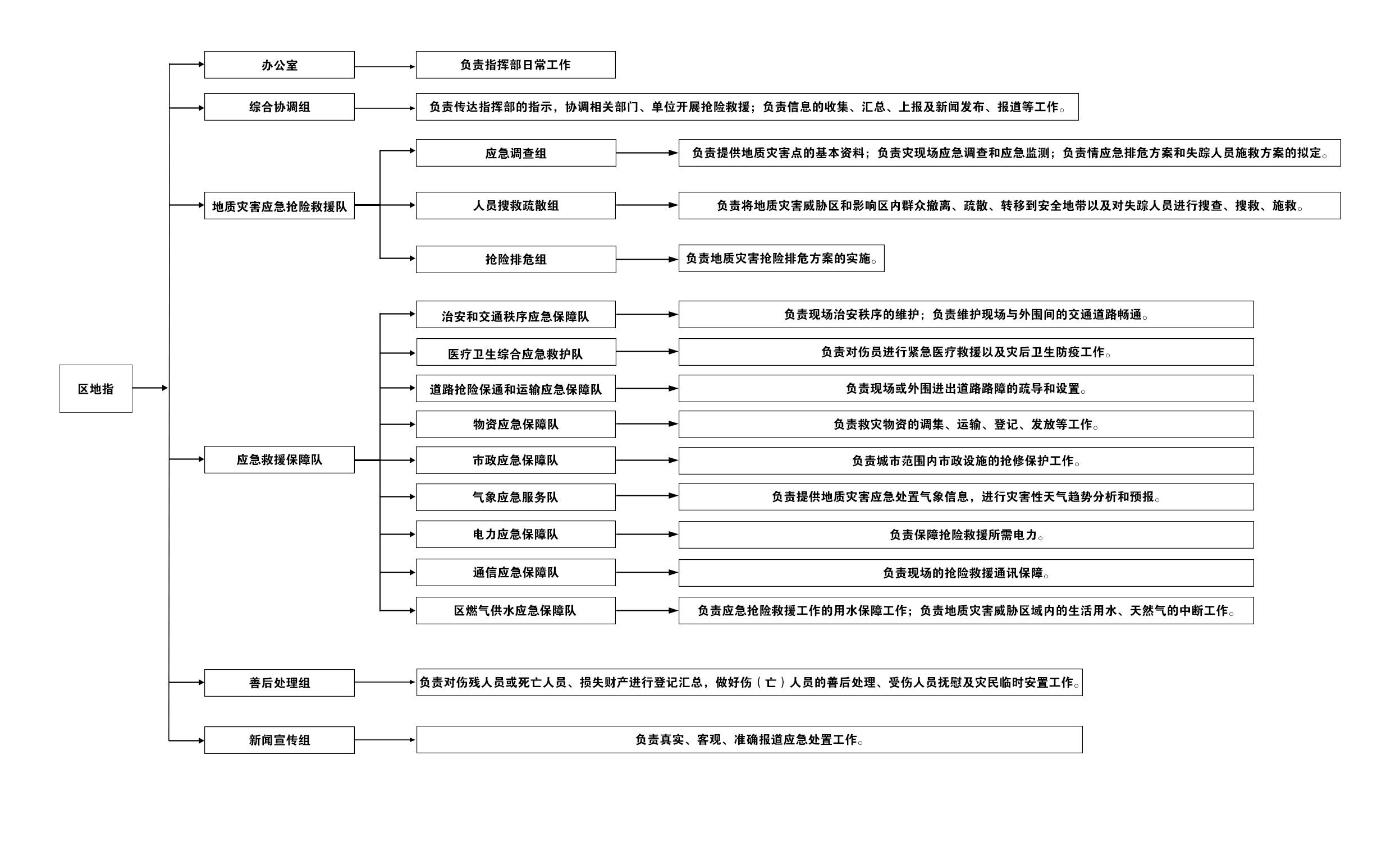 区地指是区自然灾害应急总指挥部下设的地质灾害灾(险)情的专项应急指挥机构之一,负责统筹协调处置全区突发地质灾害灾(险)情。区地指下设办公室、综合协调组、地质灾害应急救援队、应急救援保障队、善后处置组和新闻宣传组(组织机构图详见附录9.1)。
