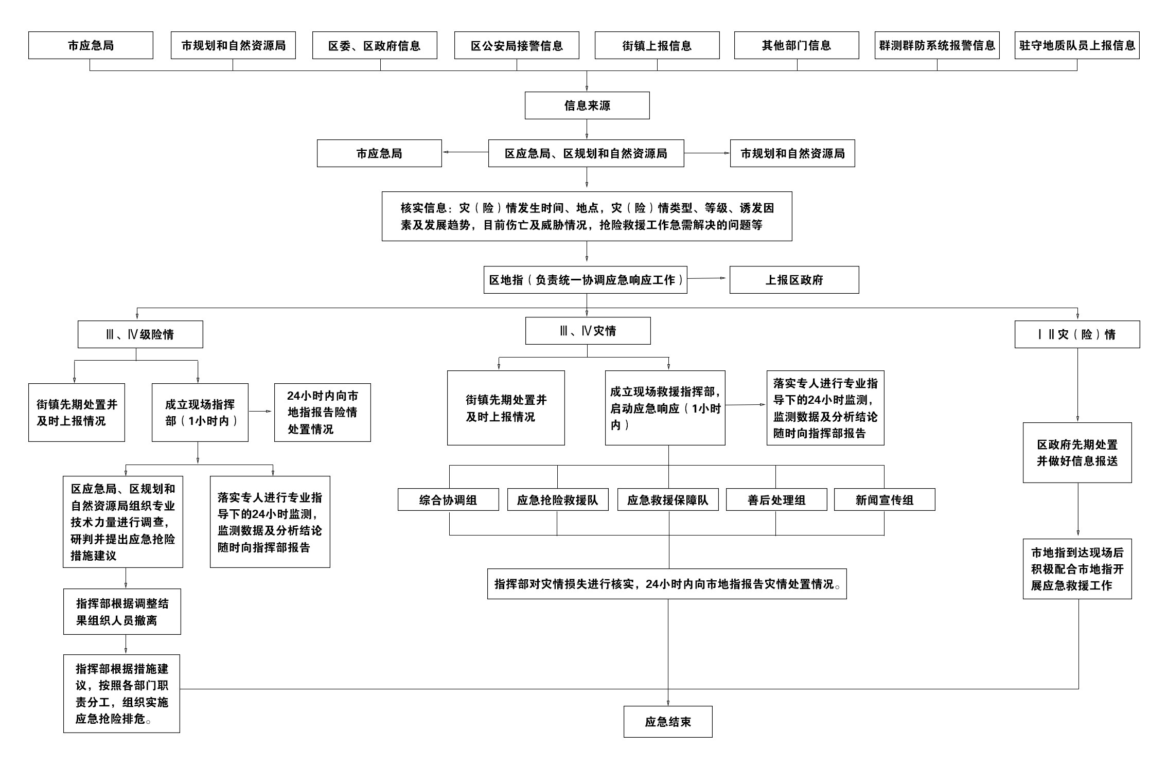 Ⅲ级、Ⅳ级地质灾害灾(险)情由区地质灾害应急救援指挥机构决定启动本级地质灾害应急预案。地质灾害灾(险)情应急处置工作结束后,由区地质灾害应急救援指挥机构决定响应终止。